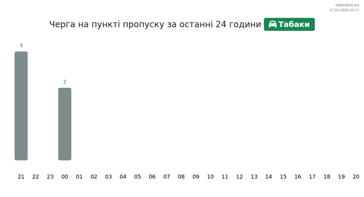 На ПП Табаки для легкових автомобілів прогнозується очікування 15-39 хвилин. Уникайте годин пік: 12:00, 13:00, 07:00. Найкращий час для перетину – 20:00, 21:00, 23:00.
