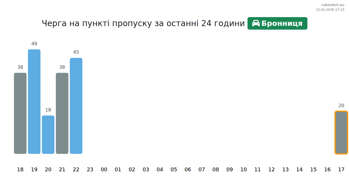 На Бронниці час очікування для легкових автомобілів становить від 15 до 465 хвилин. Щоб уникнути затримок, рекомендуємо уникати годин пік: 19:00, 13:00 та 18:00. Найкоротші черги очікуються близько 17:00, 20:00 та 21:00.