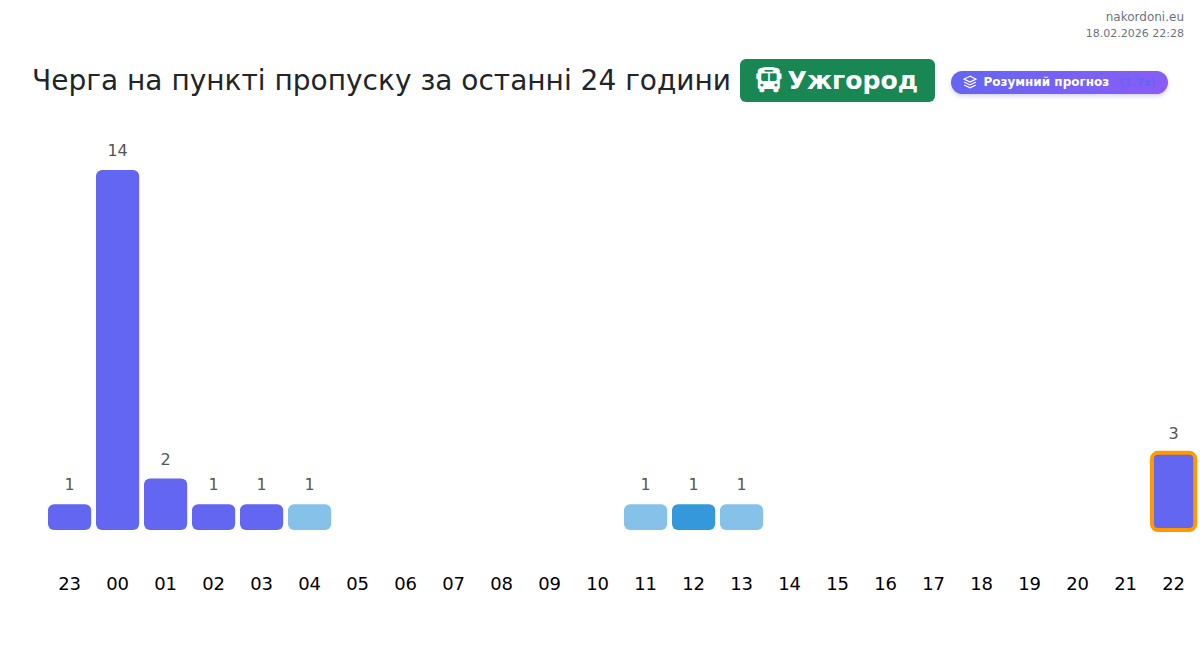 Прогноз черг для Ужгорода показує час очікування від 15 до 1295 хвилин. Рекомендується уникати пікових годин близько 11:00, 02:00 та 22:00. Для коротших черг, розгляньте перетин кордону о 15:00, 05:00 або 06:00.