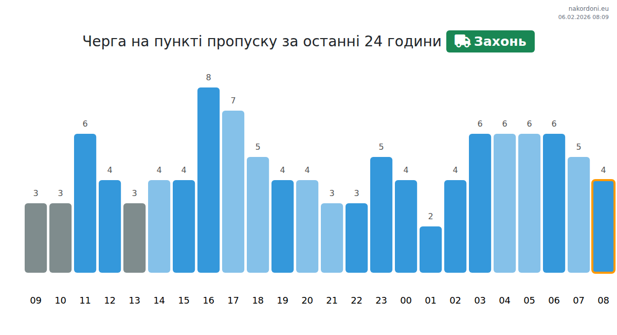 Для уникнення довгих черг на кордоні на пункті пропуску Захонь - авто, рекомендуємо планувати перетин кордону в години найменшого навантаження. Згідно з даними за минулу добу, найменша кількість автомобілів спостерігалася між 1:00 та 4:00 годинами. Це ідеальний час для перетину кордону, щоб зекономити час і уникнути затримок.