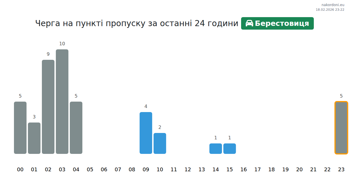 На пункті пропуску Берестовиця очікування для легкових авто становить 15-15 хвилин. Щоб уникнути черг, краще не їхати в години пік: 11:00, 12:00, 13:00. Найкращий час для перетину: 14:00, 15:00, 16:00.