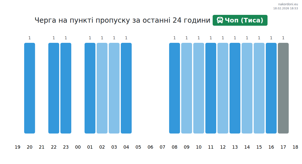 На ПП Чоп (Тиса) час очікування для автобусів прогнозується від 15 до 1135 хвилин. Уникайте пікових годин: 07:00, 13:00, 11:00. Найкоротші черги очікуються близько 14:00, 16:00 та 17:00.