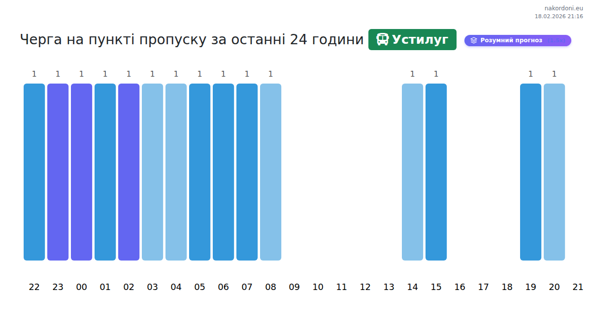 На пункті пропуску Устилуг для автобусів очікується час очікування від 15 до 95 хвилин. Уникайте перетину в пікові години між 10:00 та 12:00. Для потенційно коротших черг розгляньте перетин о 15:00, 18:00 або 05:00.