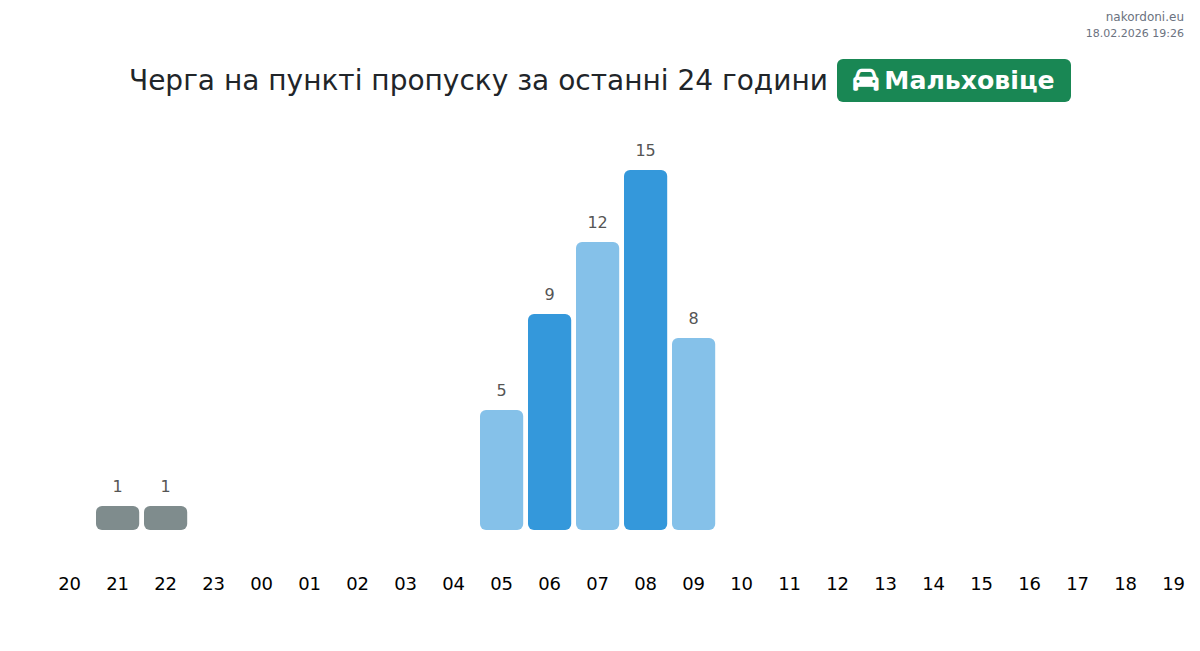 На пункті пропуску Мальховіце очікуйте час очікування для легкових авто від 15 до 165 хвилин. Уникайте пікових годин о 14:00, 02:00 та 15:00 для швидшого перетину. Найкоротші черги очікуються о 22:00, 23:00 та 09:00.