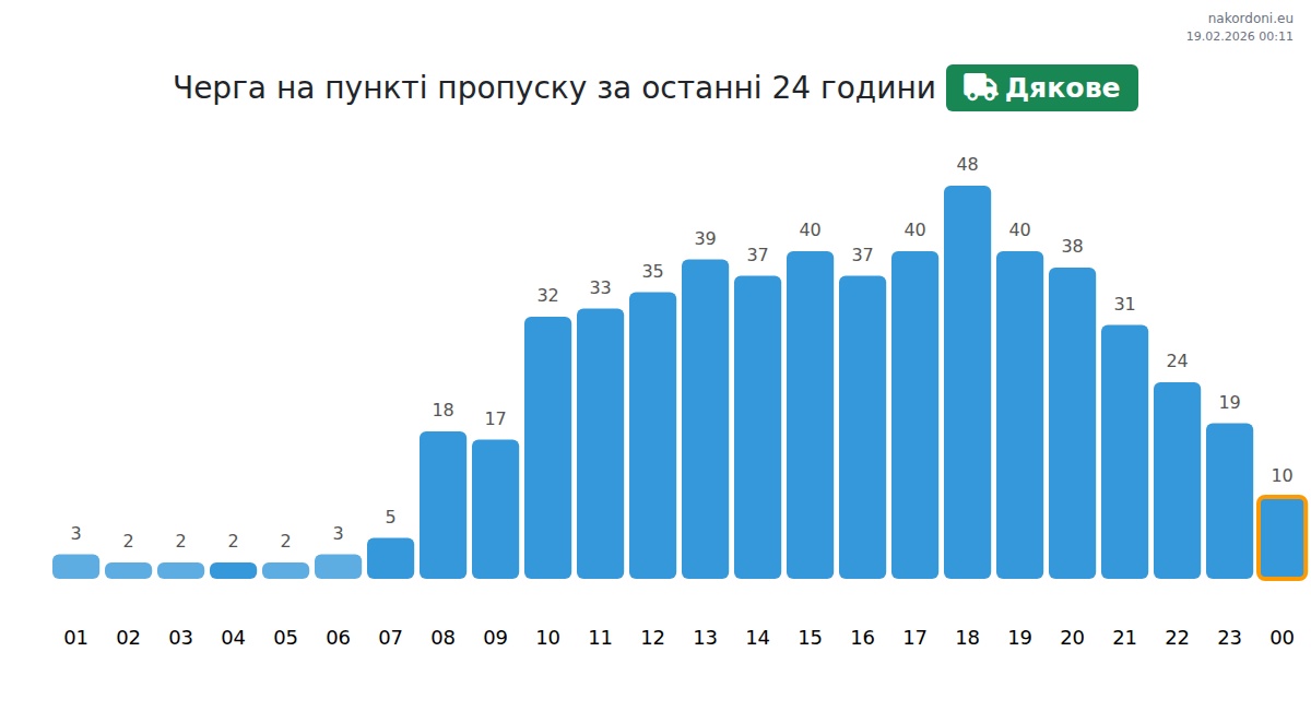У пункті Дякове час очікування варіюється від 15 до 495 хвилин. Рекомендуємо уникати пікових годин о 16:00, 18:00 та 00:00. Найкращий час для швидкого перетину кордону — з 02:00 до 04:00 ранку.