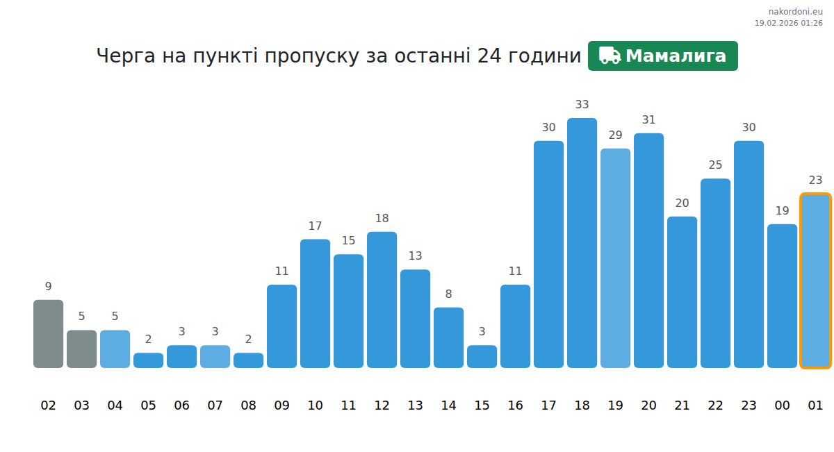 На КПП Мамалига очікуйте затримки для ТЗ 15-1935 хв. Уникайте годин пік (19:00, 20:00, 18:00) через великі черги. Найкращий час для перетину: 02:00, 03:00, 07:00.