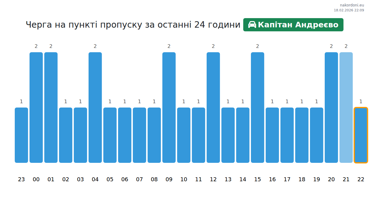 Для уникнення довгих черг на кордоні на пункті пропуску Капітан Андреєво - авто, рекомендуємо планувати перетин кордону в години найменшого навантаження. Згідно з даними за минулу добу, найменша кількість автомобілів спостерігалася між :00 та 2:00 годинами. Це ідеальний час для перетину кордону, щоб зекономити час і уникнути затримок.
