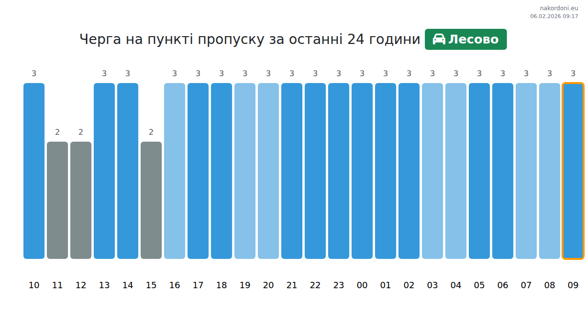На КПП Лесово час очікування для легкових авто становить 45 хвилин. Найбільші черги очікуються о 12:00, 13:00 та 14:00, тому радимо уникати цих годин. Найкращий час для перетину — з 15:00 до 17:00.