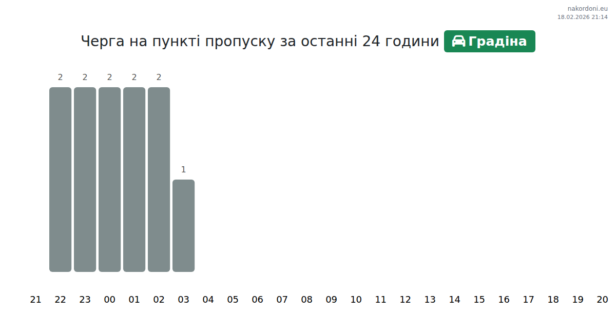 На пункті пропуску Градіна час очікування для легкових автомобілів становить 25-55 хвилин. Рекомендуємо уникати годин пік о 09:00, 13:00 та 14:00. Найкращий час для перетину кордону — 19:00, 20:00 або 21:00, коли черги мінімальні.