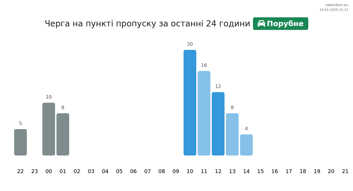 На ПП Порубне, час очікування авто 15-717 хв. Уникайте пікових годин: 08:00, 17:00, 03:00. Найкращий час для перетину: 15:00, 18:00, 21:00.
