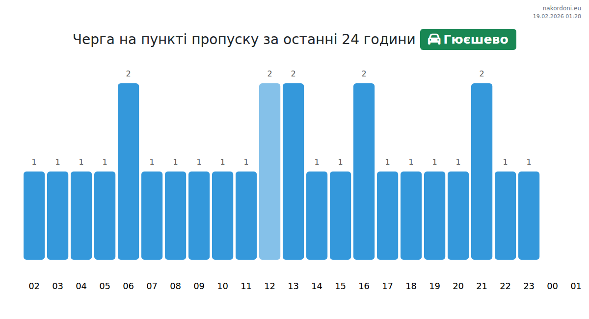 Для уникнення довгих черг на кордоні на пункті пропуску Гюєшево - авто, рекомендуємо планувати перетин кордону в години найменшого навантаження. Згідно з даними за минулу добу, найменша кількість автомобілів спостерігалася між :00 та 1:00 годинами. Це ідеальний час для перетину кордону, щоб зекономити час і уникнути затримок.