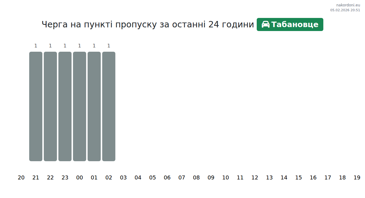 На пункті «Табановце» очікуваний час очікування для легкових автомобілів становить 25-65 хвилин. Щоб уникнути довгих черг, рекомендуємо уникати годин пік: 13:00, 08:00 та 10:00. Найкращий час для перетину кордону очікується о 15:00, 16:00 та 18:00.