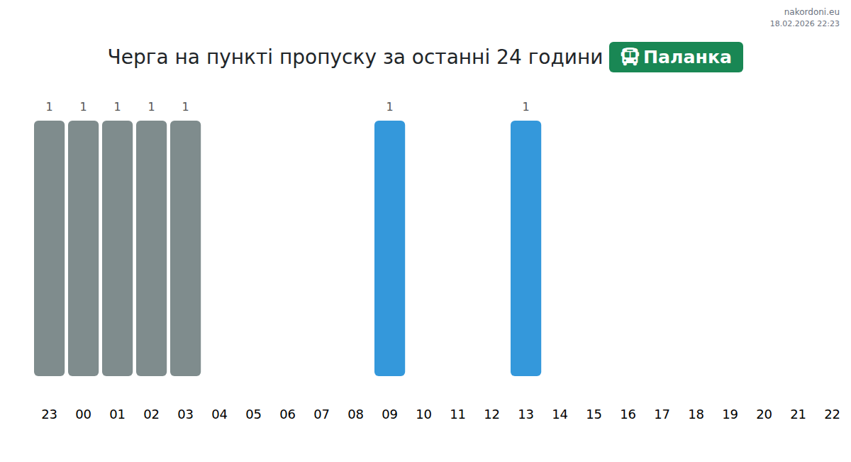 На пункті Паланка очікуваний час очікування для автобусів становить від 15 до 135 хвилин. Уникайте перетину під час пікових годин о 09:00, 13:00 та 14:00. Для коротших черг рекомендується перетинати кордон з 15:00 до 17:00.