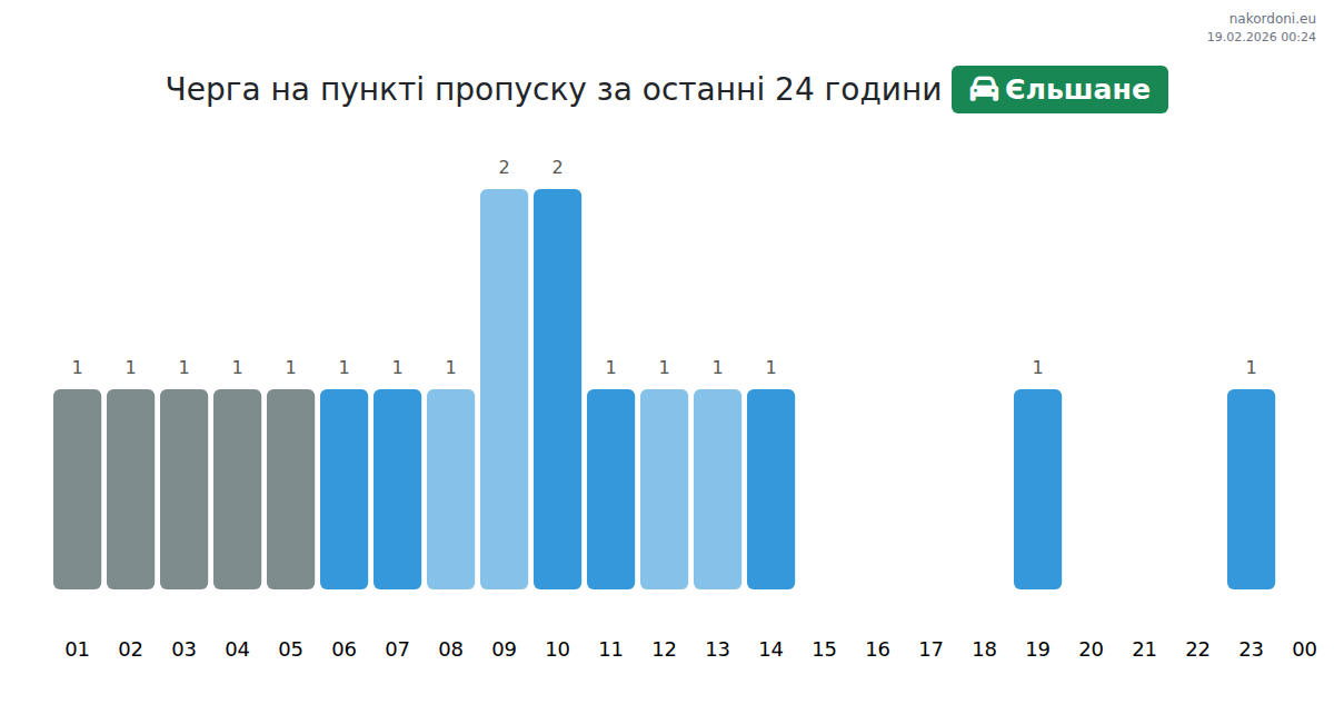 Для уникнення довгих черг на кордоні на пункті пропуску Єльшане - легковий автомобіль, рекомендуємо планувати перетин кордону в години найменшого навантаження. Згідно з даними за минулу добу, найменша кількість автомобілів спостерігалася між 7:00 та 11:00 годинами. Це ідеальний час для перетину кордону, щоб зекономити час і уникнути затримок.