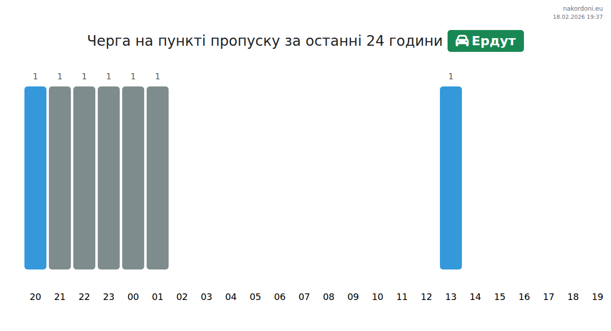 На пункті пропуску Ердут, час очікування для легкових автомобілів складає 71-71 хвилину. Рекомендуємо уникати години пік з 12:00 до 14:00. Найкоротші черги очікуються з 15:00 до 17:00.