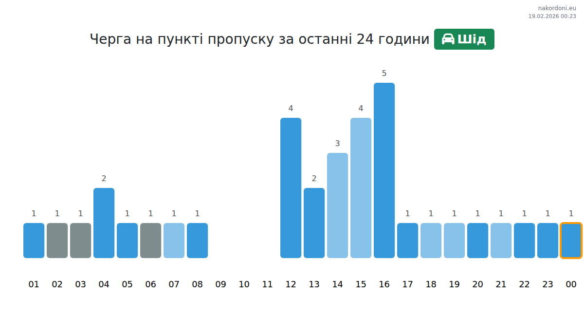 На пункті пропуску Шід очікуваний час очікування для легкових автомобілів становить 71-83 хвилини, в середньому 73 хвилини. Уникайте пікових годин (12:00, 13:00, 14:00) для менших черг. Найкращий час для перетину — 15:00-17:00.