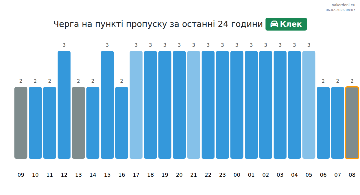 Для уникнення довгих черг на кордоні на пункті пропуску Клек - авто, рекомендуємо планувати перетин кордону в години найменшого навантаження. Згідно з даними за минулу добу, найменша кількість автомобілів спостерігалася між :00 та 1:00 годинами. Це ідеальний час для перетину кордону, щоб зекономити час і уникнути затримок.