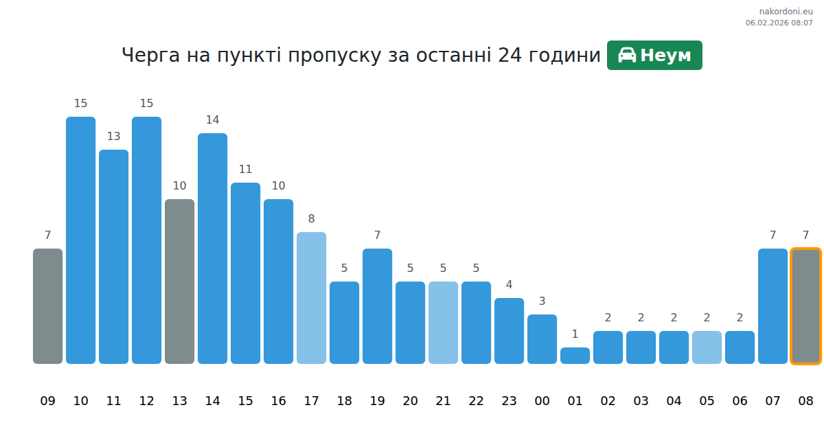 На пункті пропуску Неум очікується черга від 77 до 131 хвилини. Найбільше навантаження прогнозується о 09:00, 13:00 та 14:00, тому радимо планувати переїзд на 23:00, 00:00 або 01:00 для швидкого перетину.