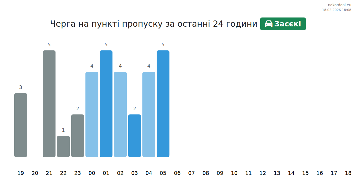 На пункті пропуску Засєкі очікуйте час очікування 15-45 хвилин. Уникайте пікових годин о 08:00, 20:00 та 06:00 для легкових автомобілів. Найкращий час для перетину — 17:00, 19:00 та 23:00 для коротших черг.