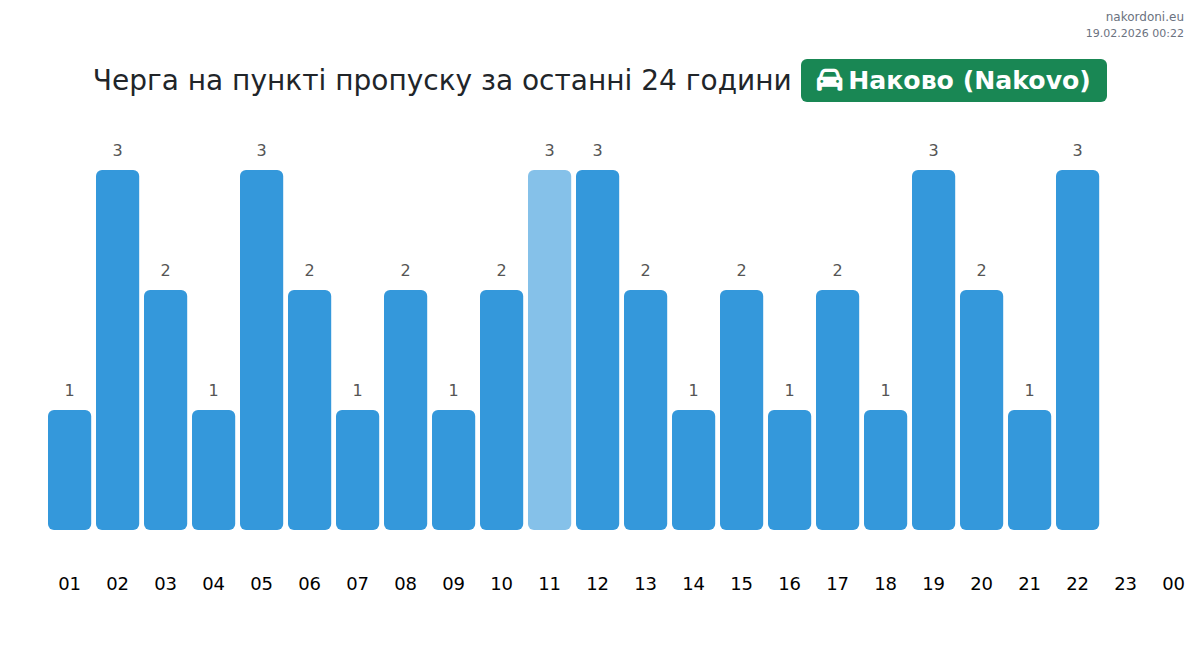 Для уникнення довгих черг на кордоні на пункті пропуску Наково (Nakovo) - авто, рекомендуємо планувати перетин кордону в години найменшого навантаження. Згідно з даними за минулу добу, найменша кількість автомобілів спостерігалася між 1:00 та 4:00 годинами. Це ідеальний час для перетину кордону, щоб зекономити час і уникнути затримок.