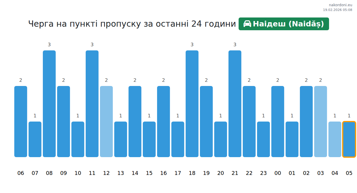 Для уникнення довгих черг на кордоні на пункті пропуску Наідеш (Naidăș) - авто, рекомендуємо планувати перетин кордону в години найменшого навантаження. Згідно з даними за минулу добу, найменша кількість автомобілів спостерігалася між :00 та 2:00 годинами. Це ідеальний час для перетину кордону, щоб зекономити час і уникнути затримок.