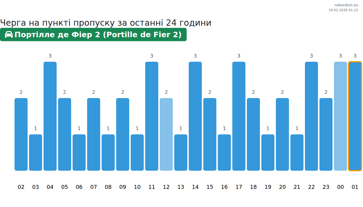 Для уникнення довгих черг на кордоні на пункті пропуску Портілле де Фіер 2 (Portille de Fier 2) - авто, рекомендуємо планувати перетин кордону в години найменшого навантаження. Згідно з даними за минулу добу, найменша кількість автомобілів спостерігалася між :00 та 3:00 годинами. Це ідеальний час для перетину кордону, щоб зекономити час і уникнути затримок.