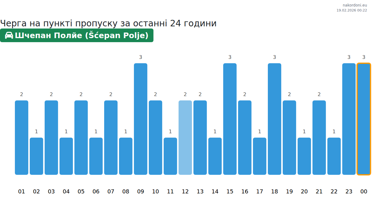 Для уникнення довгих черг на кордоні на пункті пропуску Шчепан Полйе (Šćepan Polje) - авто, рекомендуємо планувати перетин кордону в години найменшого навантаження. Згідно з даними за минулу добу, найменша кількість автомобілів спостерігалася між 2:00 та 5:00 годинами. Це ідеальний час для перетину кордону, щоб зекономити час і уникнути затримок.