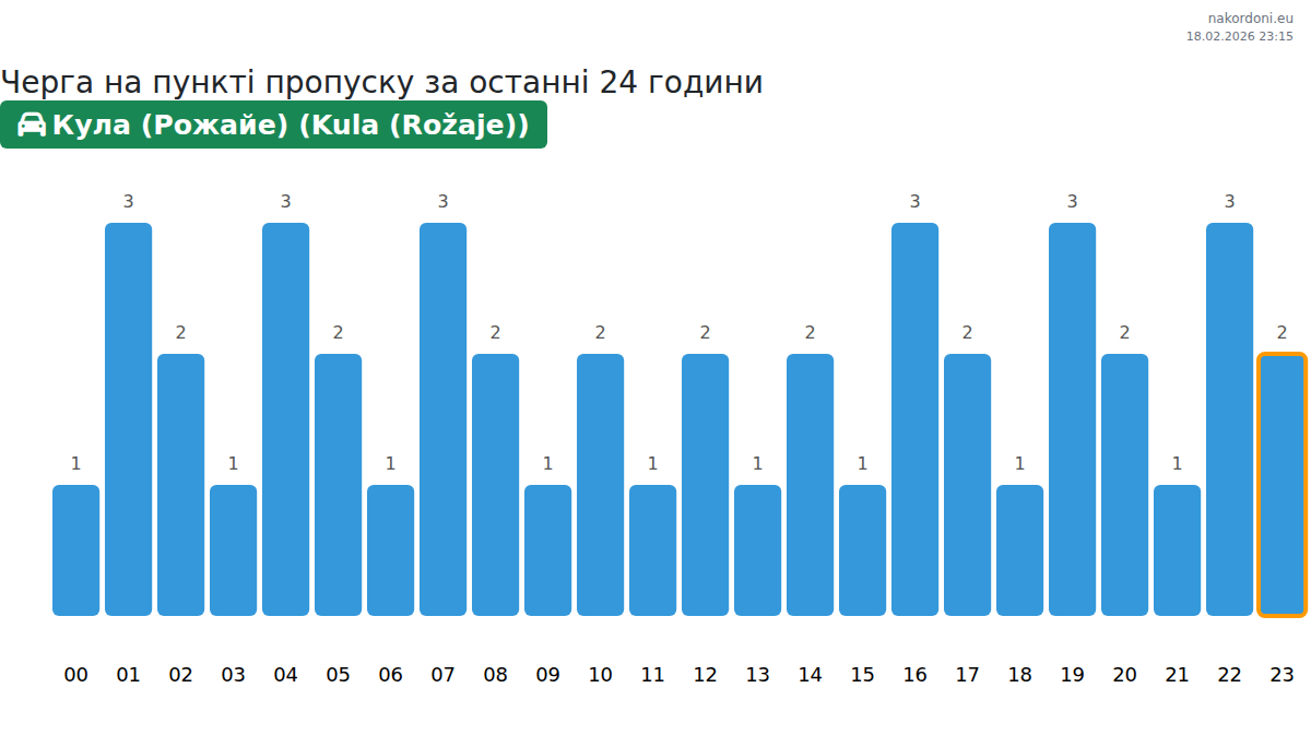 Для уникнення довгих черг на кордоні на пункті пропуску Кула (Рожайе) (Kula (Rožaje)) - авто, рекомендуємо планувати перетин кордону в години найменшого навантаження. Згідно з даними за минулу добу, найменша кількість автомобілів спостерігалася між :00 та 3:00 годинами. Це ідеальний час для перетину кордону, щоб зекономити час і уникнути затримок.