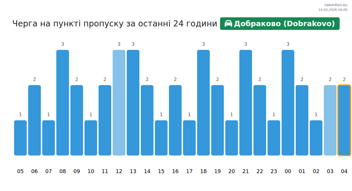 Для уникнення довгих черг на кордоні на пункті пропуску Добраково (Dobrakovo) - авто, рекомендуємо планувати перетин кордону в години найменшого навантаження. Згідно з даними за минулу добу, найменша кількість автомобілів спостерігалася між :00 та 3:00 годинами. Це ідеальний час для перетину кордону, щоб зекономити час і уникнути затримок.