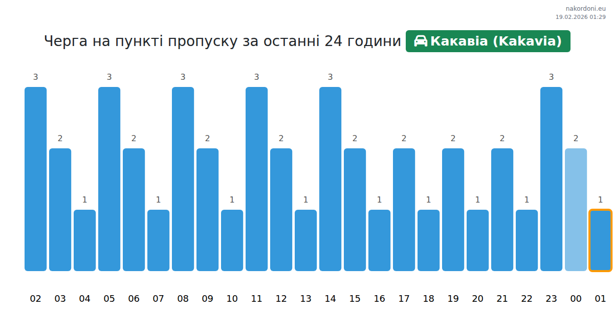 Для уникнення довгих черг на кордоні на пункті пропуску Какавіа (Kakavia) - авто, рекомендуємо планувати перетин кордону в години найменшого навантаження. Згідно з даними за минулу добу, найменша кількість автомобілів спостерігалася між :00 та 3:00 годинами. Це ідеальний час для перетину кордону, щоб зекономити час і уникнути затримок.