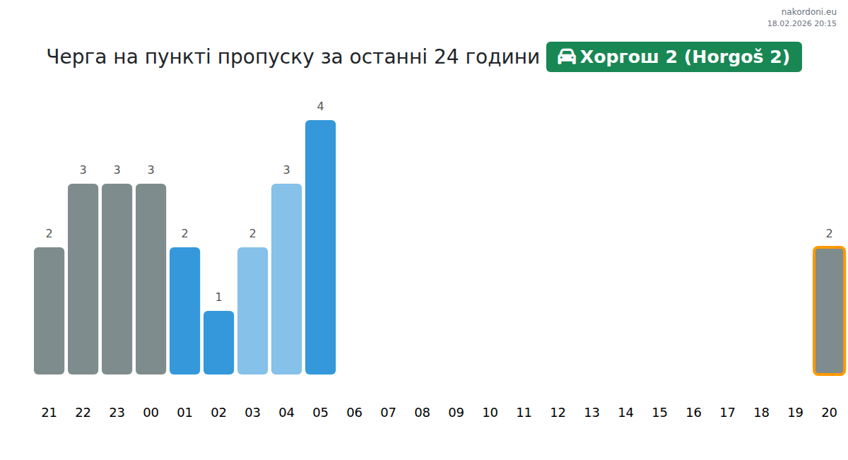 Для уникнення довгих черг на кордоні на пункті пропуску Хоргош 2 (Horgoš 2) - легковий автомобіль, рекомендуємо планувати перетин кордону в години найменшого навантаження. Згідно з даними за минулу добу, найменша кількість автомобілів спостерігалася між 2:00 та 5:00 годинами. Це ідеальний час для перетину кордону, щоб зекономити час і уникнути затримок.