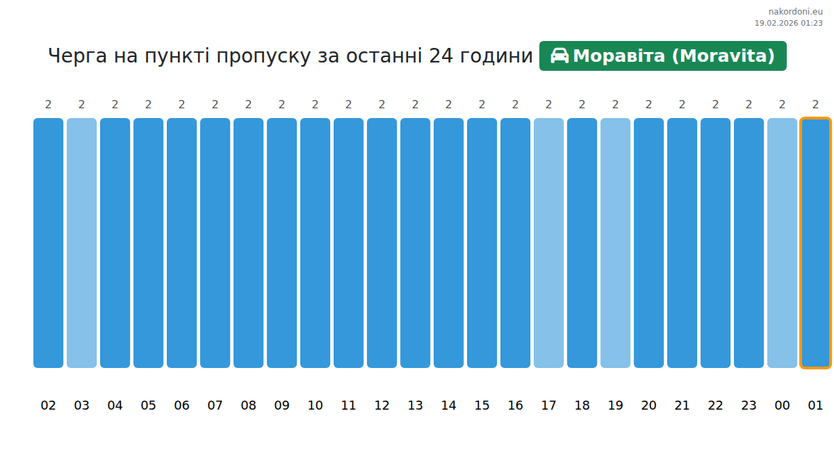 Для уникнення довгих черг на кордоні на пункті пропуску Моравіта (Moravita) - авто, рекомендуємо планувати перетин кордону в години найменшого навантаження. Згідно з даними за минулу добу, найменша кількість автомобілів спостерігалася між 1:00 та 2:00 годинами. Це ідеальний час для перетину кордону, щоб зекономити час і уникнути затримок.
