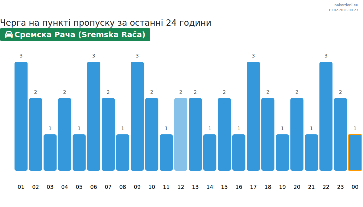 Для уникнення довгих черг на кордоні на пункті пропуску Сремска Рача (Sremska Rača) - авто, рекомендуємо планувати перетин кордону в години найменшого навантаження. Згідно з даними за минулу добу, найменша кількість автомобілів спостерігалася між 2:00 та 4:00 годинами. Це ідеальний час для перетину кордону, щоб зекономити час і уникнути затримок.