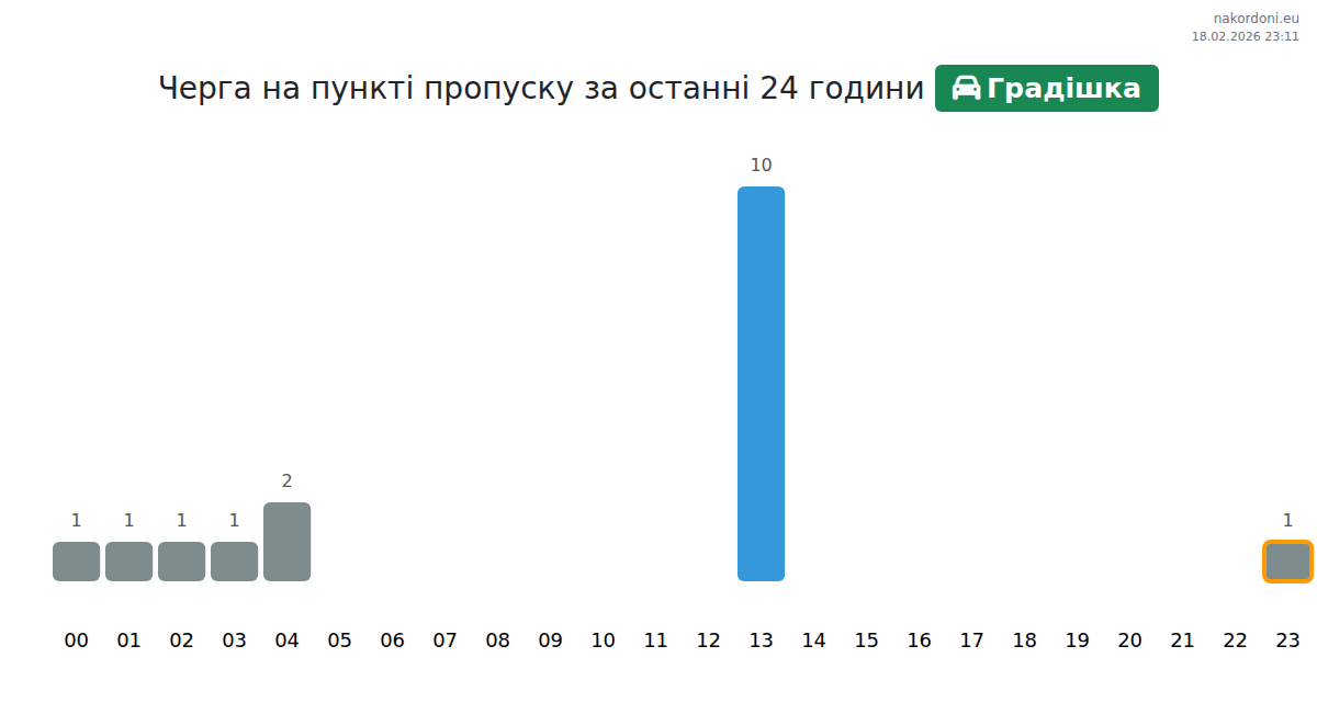На пункті Градішка очікуваний час очікування для легкових автомобілів становить 71-113 хвилин. Уникайте перетину о 12:00, 15:00 та 08:00 через пікові години. Для коротших черг рекомендується перетинати кордон між 21:00 та 23:00.