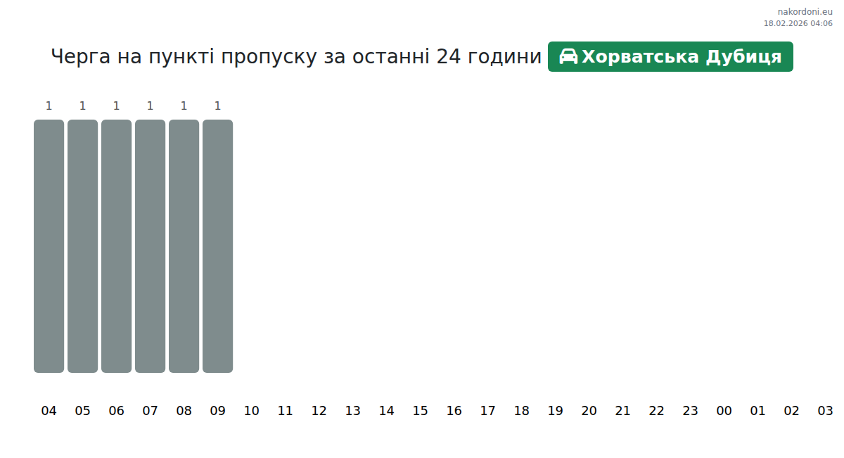 На Хорватській Дубиці очікуваний час очікування для легкових автомобілів становить 71-95 хвилин. Пікові години, яких варто уникати: 11:00, 13:00 та 14:00. Найкоротші черги очікуються між 15:00, 16:00 та 18:00.