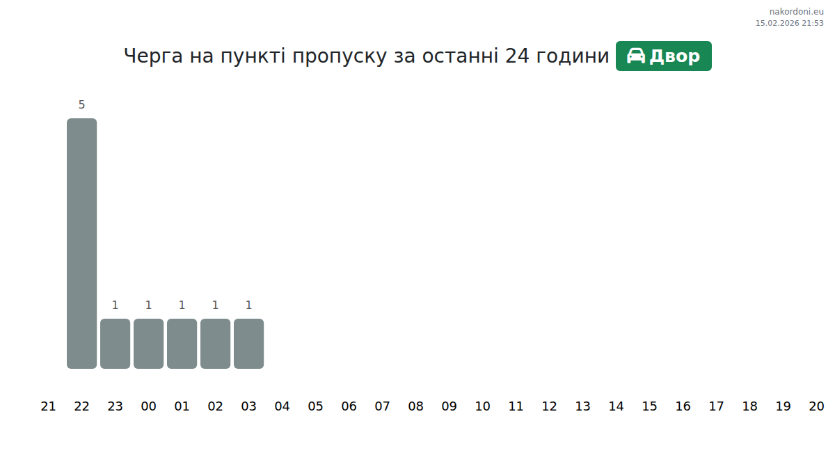 На Дворі очікуйте час очікування для легкових автомобілів 71-89 хвилин. Уникайте годин пік: 07:00, 11:00, 12:00. Для коротших черг, перетинайте кордон між 17:00 та 19:00.