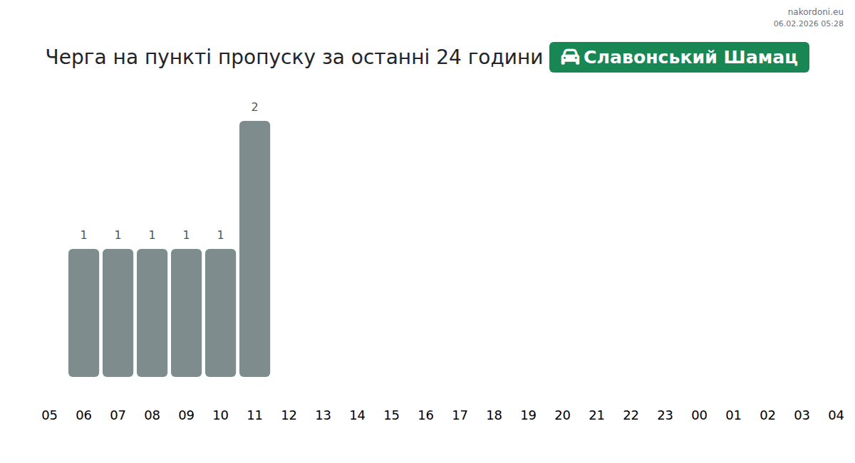 На Славонський Шамац легкові автомобілі очікують черги 71-83 хвилини. Уникайте пікових годин: 09:00, 11:00, 15:00. Найкращий час для перетину: 18:00-20:00.