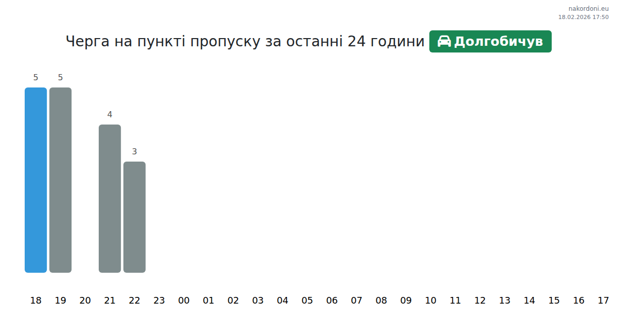 На Долгобичуві очікуйте час очікування для легкових автомобілів від 15 до 75 хвилин. Уникайте пікових годин о 17:00, 03:00 та 02:00. Найкоротші черги прогнозуються на 22:00, 04:00 та 05:00.