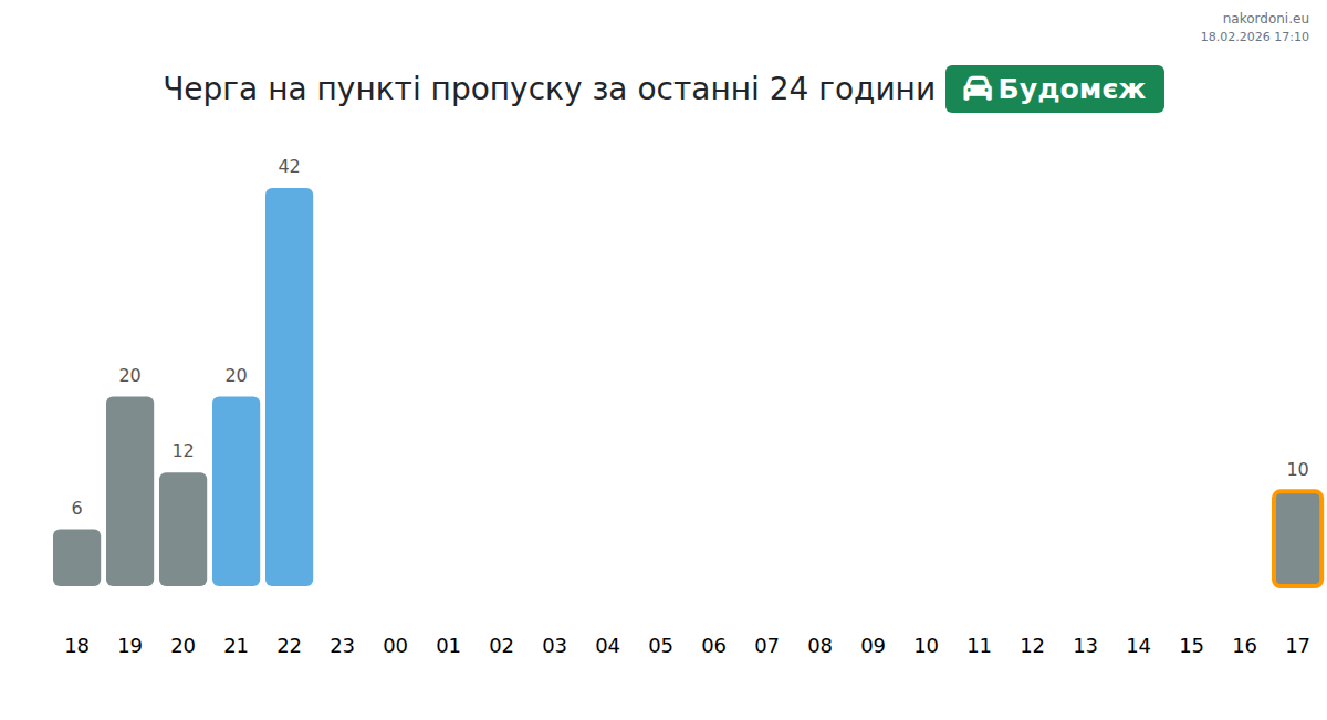 На Будомєж час очікування для легкових авто 15-2415 хв (середнє 660 хв). Уникайте піку: 21:00, 01:00, 20:00. Найкращий час: 02:00, 06:00, 09:00.
