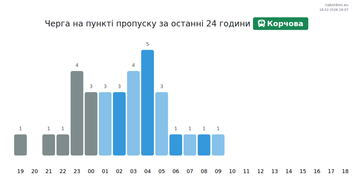На пункті Корчова для автобусів прогнозується час очікування від 15 до 415 хвилин. Уникайте пікових годин о 00:00, 02:00 та 07:00. Найкращий час для перетину – 17:00, 15:00 та 16:00 для коротших черг.