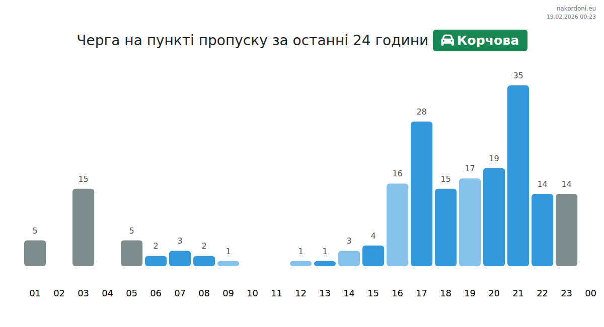 На Корчовій, час очікування для легкових автомобілів становить від 27 до 111 хвилин. Уникайте перетину кордону між 13:00, 15:00 та 14:00 через пікову завантаженість. Для коротших черг рекомендується подорожувати о 23:00, 05:00 або 00:00.