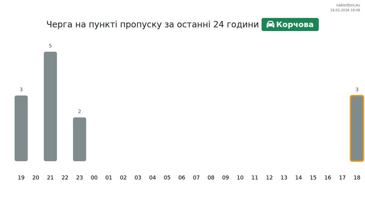 На Корчова час очікування легкових авто: 15-1055 хвилин. Уникайте 20:00, 23:00, 01:00 через пік. Кращий час для перетину: 12:00, 19:00, 21:00.